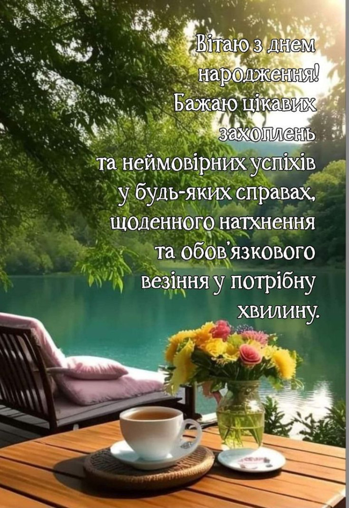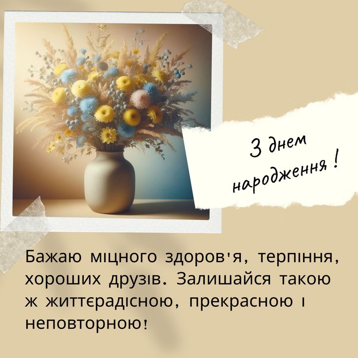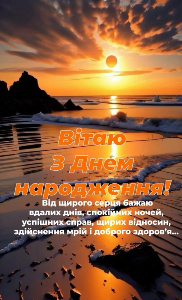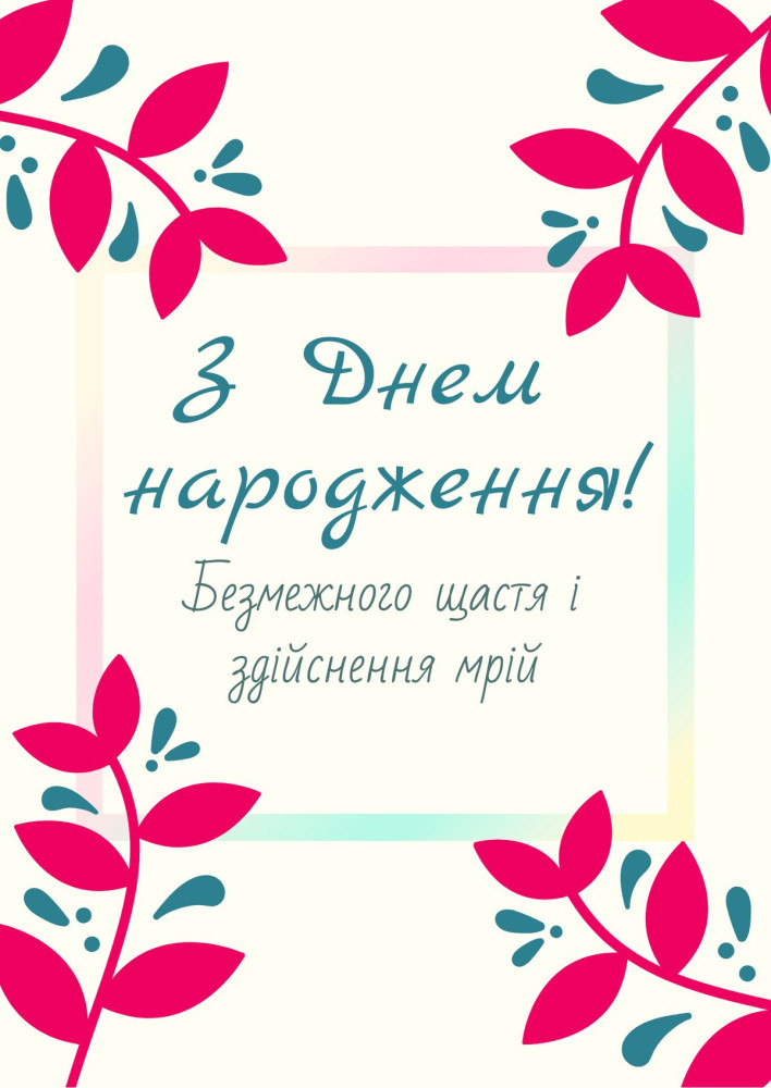 "З днем народження! Бажаю тобі здоров'я, щастя та успіхів у всіх починаннях. Нехай кожен день буде сповнений радості та натхнення!"