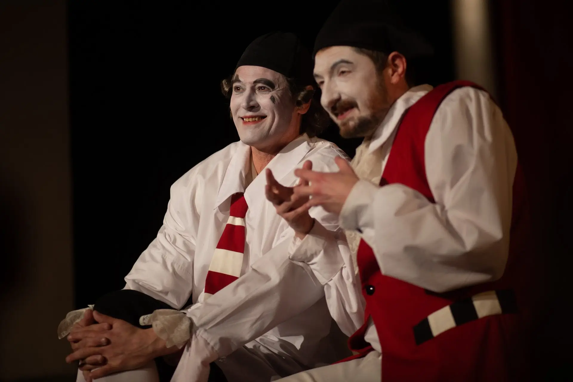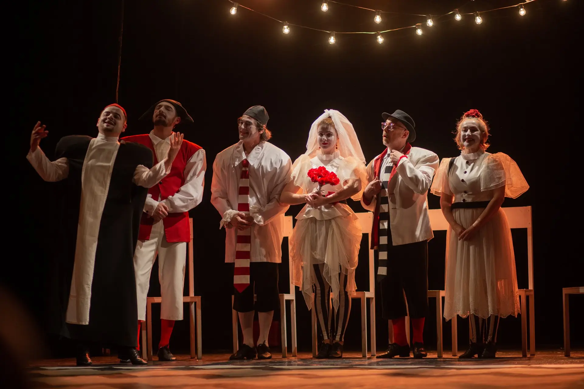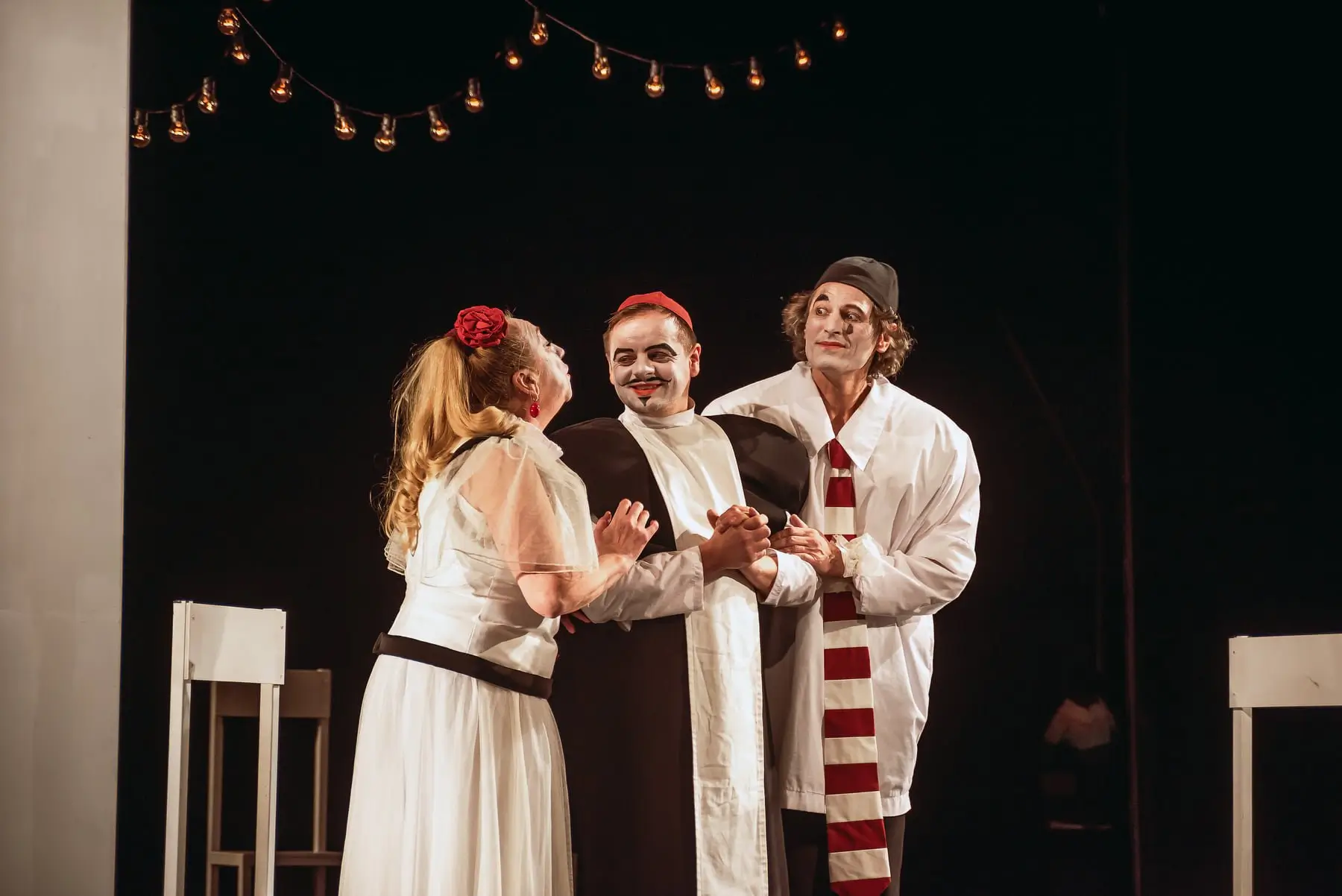 Выступление с итальянским шармом в духе комедии дель арте: быстрые перепалки, игра масок, импровизации и зажигательный темперамент, от которого сцена дышит, словно площадь маленького городка где-то между Неаполем и Венецией. Здесь честность, благородство и «высокие чувства» легко превращаются в веселый балаган — потому что человеческие порывы редко укладываются в правильные рамки.