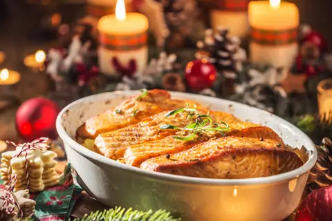 Если хочется классической праздничной атмосферы, лучше обратить внимание на утку, гуся, индейку, говядину «Веллингтон» и красную рыбу. Эти варианты ассоциируются с большим столом, красивой подачей и ощущением настоящего праздника.