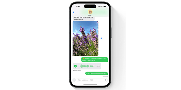 На странице Apple, посвящённой будущему релизу, уже показан как минимум один пример того, как RCS будет отображаться на iPhone. В поле ввода появится пометка «RCS», которая будет обозначать тип подключения, а в остальном интерфейс останется привычным.