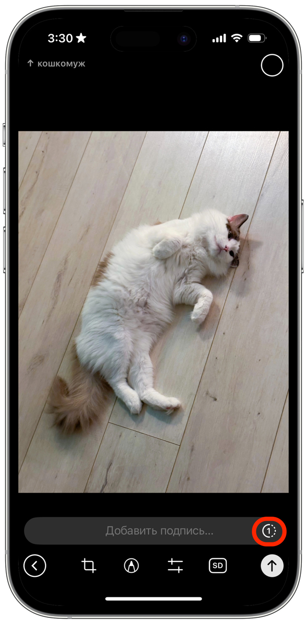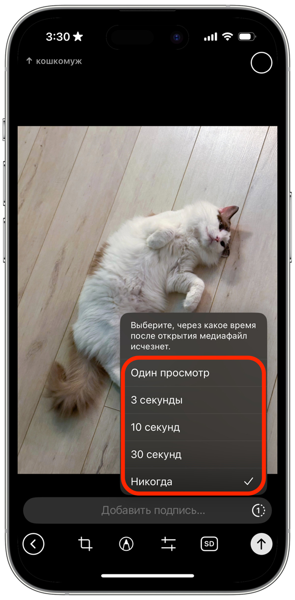 Если хотите отправить фото или видео, которое пропадёт после просмотра, откройте нужный чат и выберите файл для отправки. В окне предпросмотра нажмите на значок с единицей в неполном кружке и укажите, сколько файл будет доступен: только до первого открытия или ещё от 3 до 30 секунд после него. Когда заданное условие сработает, медиа исчезнет без возможности восстановления.