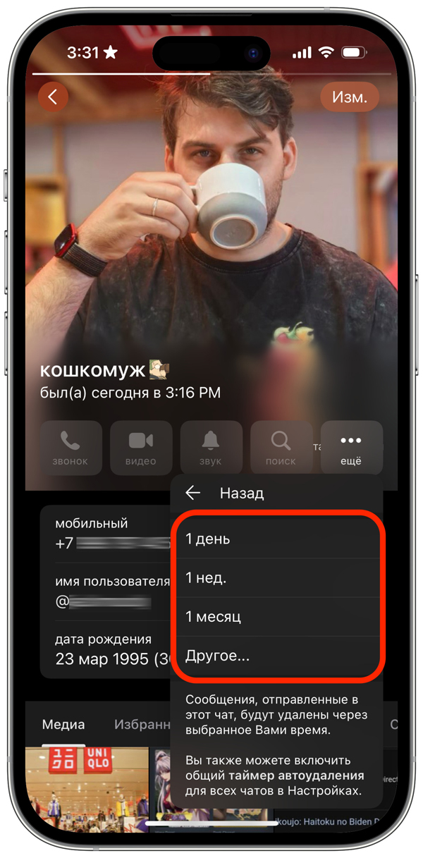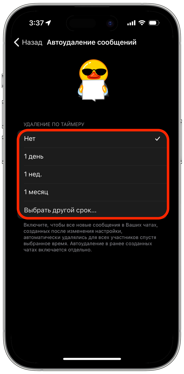 Эта функция особенно удобна, если вы хотите, чтобы чаты не накапливали лишние сообщения и файлы. Она помогает держать переписку аккуратной без необходимости постоянно чистить её вручную.