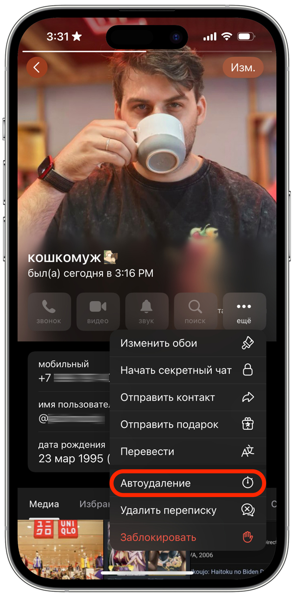Автоудаление отличается от секретных чатов тем, что доступно в любых переписках и синхронизируется между всеми вашими устройствами. В этом режиме все новые сообщения будут удаляться у всех участников через выбранный промежуток времени, независимо от того, успел их собеседник прочитать или нет.