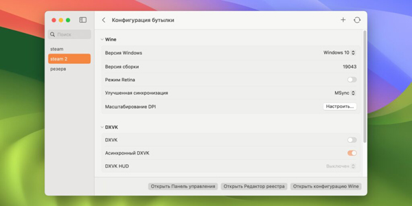 - DXVK — слой перевода на базе Vulkan. Его стоит включать только в том случае, если есть проблемы с производительностью в играх на DirectX 9, 10 и 11 или если игра вообще не хочет запускаться. Эта опция отключает D3DMetal — фреймворк, который помогает добиваться лучшей производительности в играх на DirectX 11 и 12. Параметр DXVK HUD выводит поверх экрана служебный интерфейс с данными о работе DXVK и производительности.