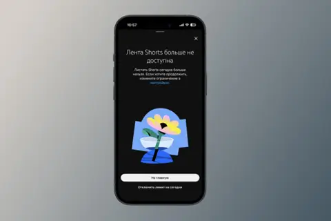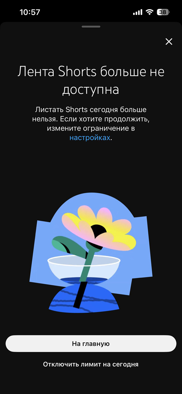 Вкладка Shorts перестанет загружать новые ролики, а на экране будет появляться уведомление о том, что лимит уже достигнут.