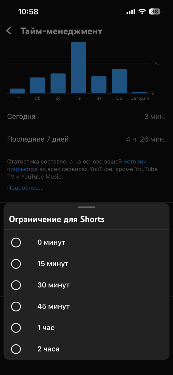 В мобильном приложении YouTube на Android и iOS появилась возможность почти полностью убрать из просмотра вертикальные ролики. Для этого в разделе с настройками тайм-менеджмента добавили новую функцию: теперь лимит на просмотр Shorts можно выставить на ноль минут. Раньше такой вариант был недоступен — минимальное ограничение начиналось с 15 минут, поэтому короткие видео всё равно продолжали оставаться в поле зрения и легко затягивали в бесконечную прокрутку.