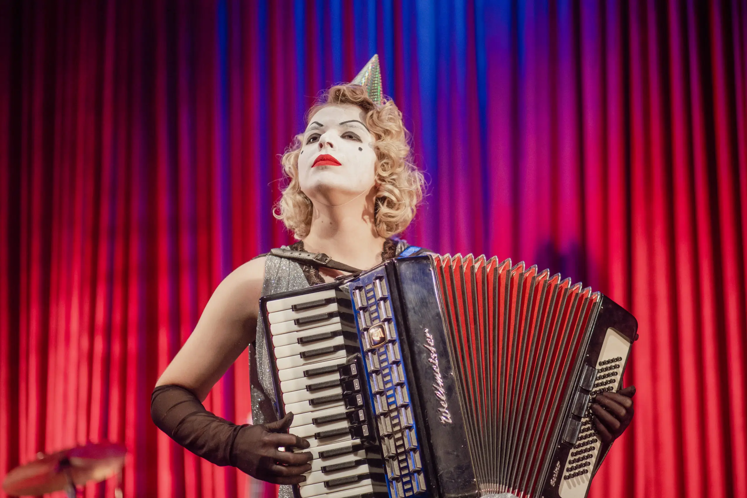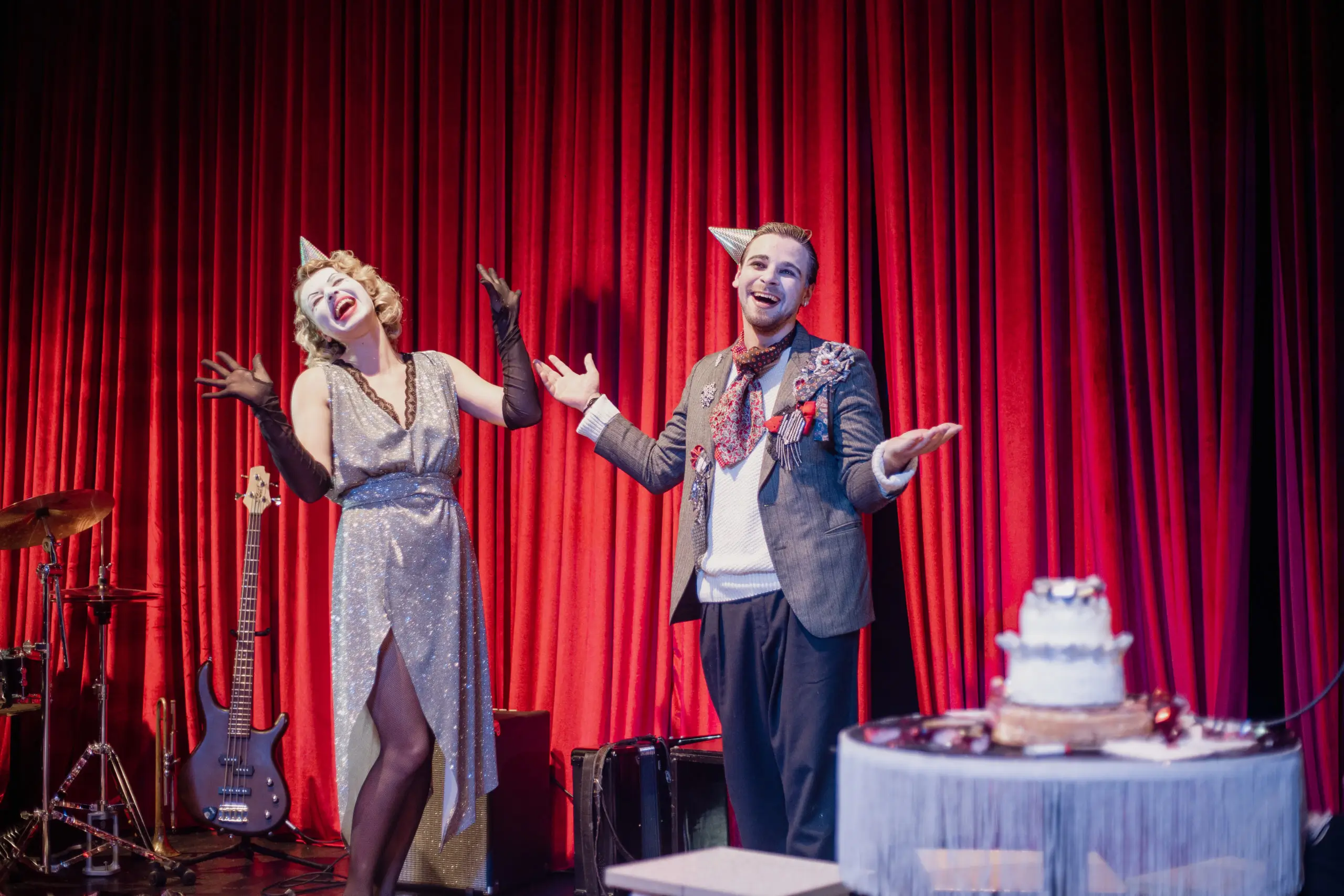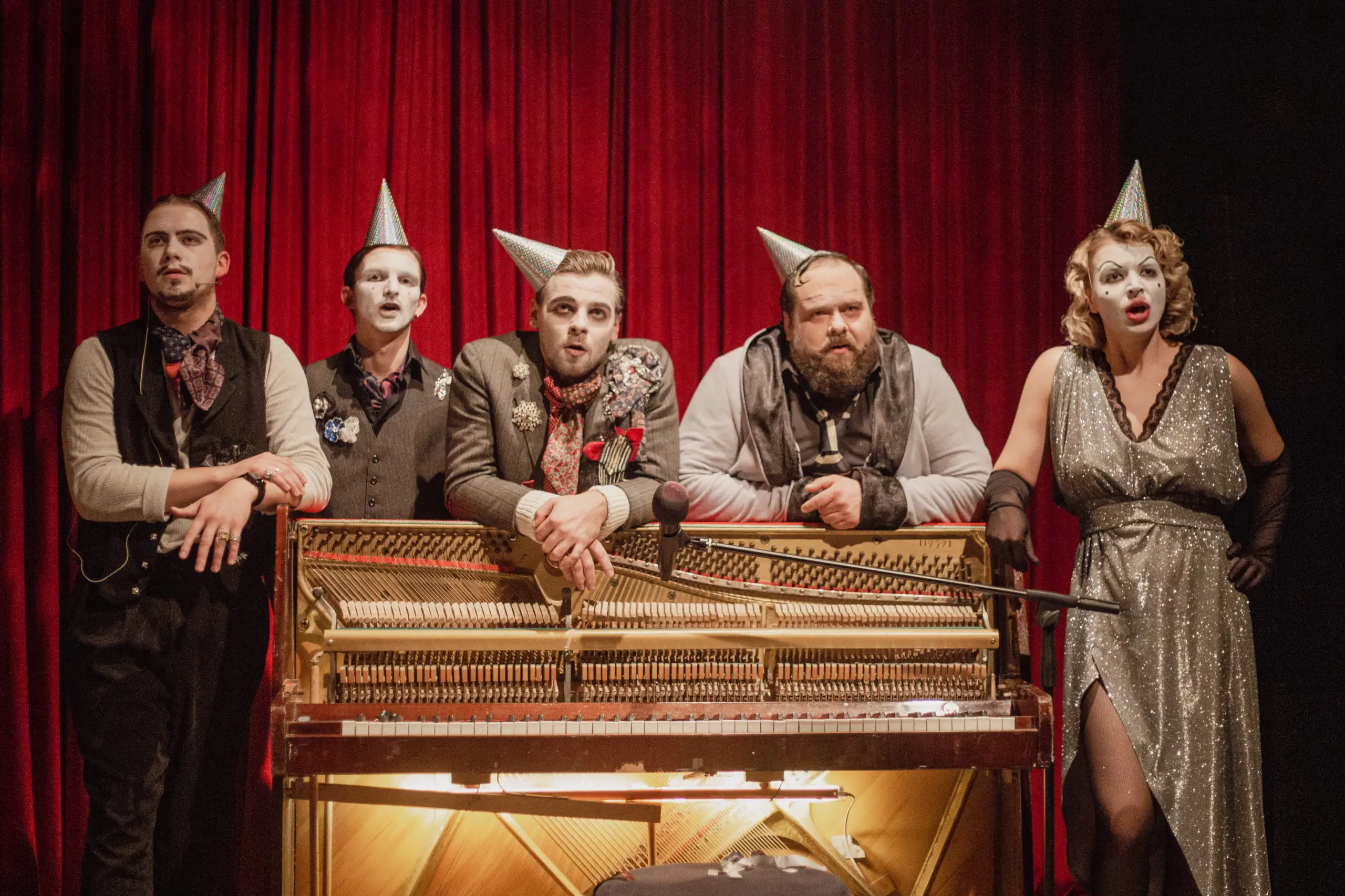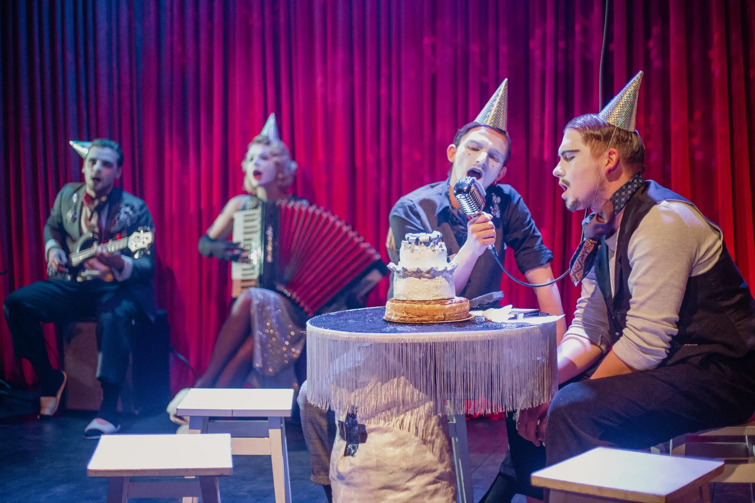Шесть молодых людей встречаются в странном «праздничном» пространстве. Они молчат немного длиннее, чем удобно. Дым от сигарет поднимается во тьму, на головах — яркие колпаки, на теле — безупречные костюмы, а посреди сцены — белый торт, от которого никто не отрезает и крошки. Все будто готово к радости, но она упрямо не приходит. Вместо нее рядом садится другая гостья — уныние. Ее еще называют хандрой, меланхолией, древним словом «акедия». Она притворяется теплом в зимний день, но внутри — ледяная. И каждому участнику есть что о ней сказать.