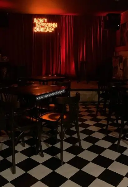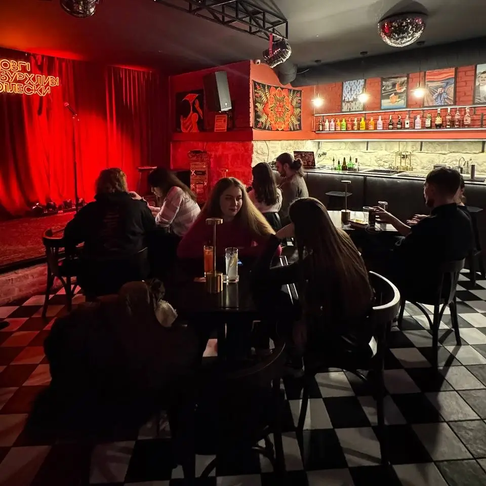 Заведение обустроено так, чтобы каждый раз было удобно: лаконичная барная зона, столы для компаний и несколько камерных уголков для свиданий. В вечерние часы свет становится мягче, музыка — теплее, а главная сцена (или мини-сцена) «притягивает» внимание гостей к событиям. Дизайн без лишнего декора: кирпич, дерево, металл и текстиль — то, что формирует узнаваемую эстетику «стендап-бара во Львове».