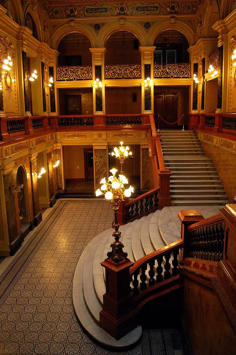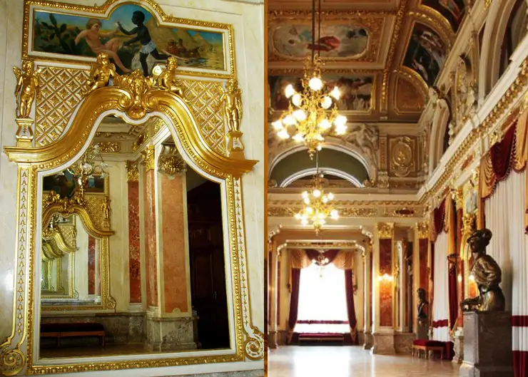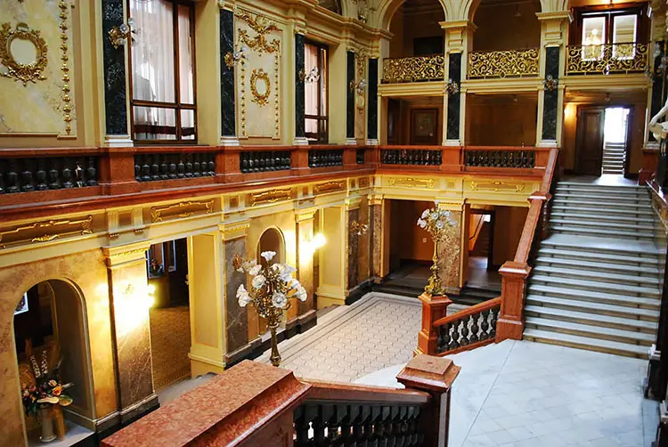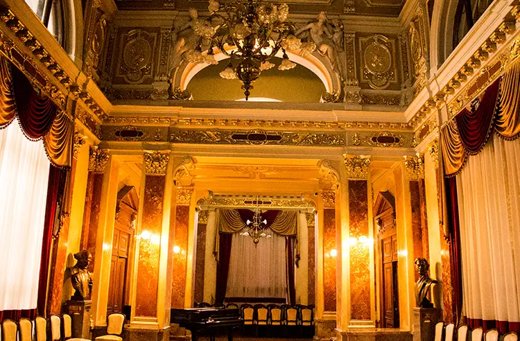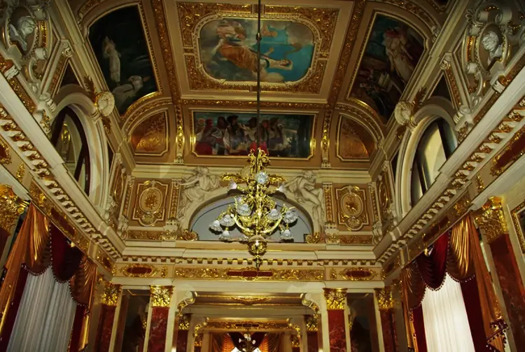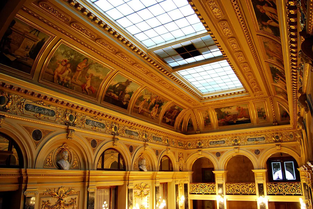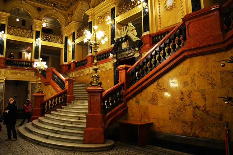 Фасад и залы — «историзм» с ощутимым влиянием неоренессанса и необарокко: богатая пластика, скульптуры, золочёный декор, зеркальные поверхности. Именно поэтому многие туристы приходят сюда даже без билета — на дневные экскурсии, чтобы рассмотреть детали вблизи.