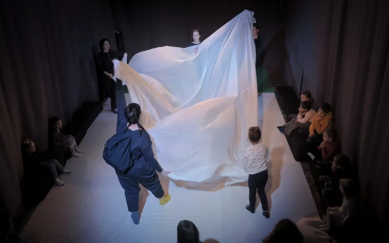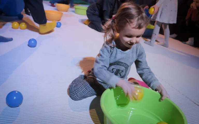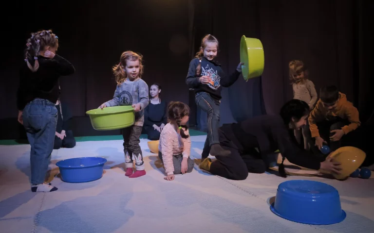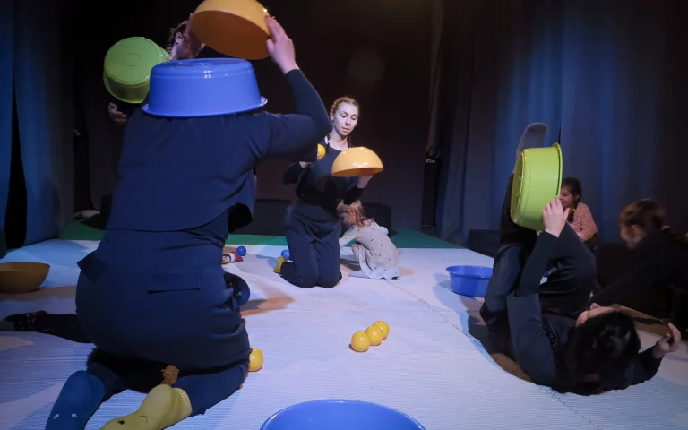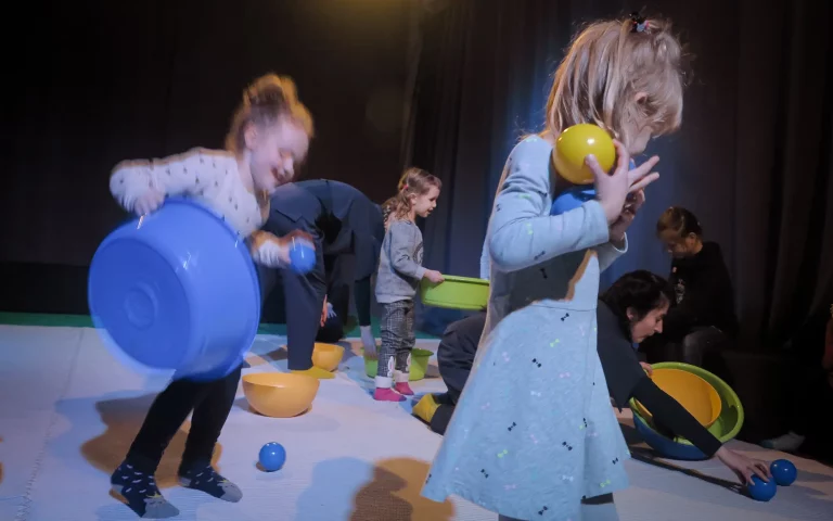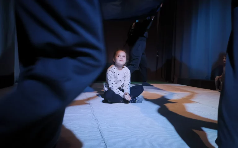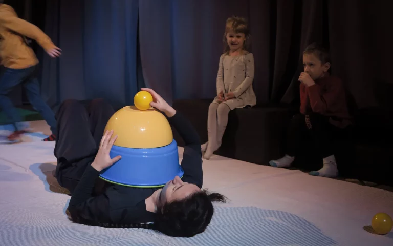 Актёры выстраивают сменные пластические композиции: линии, круги, волны, перетекающие друг в друга и приглашающие детей импровизировать рядом. Ритм то ускоряется, то замирает; жест становится подсказкой, взгляд — мостом к участию. Дверь к игре открыта всегда: можно осторожно повторять движение, придумать собственное, перейти с «зрительской» траектории в «танцевальную» и вернуться назад, когда захочется.