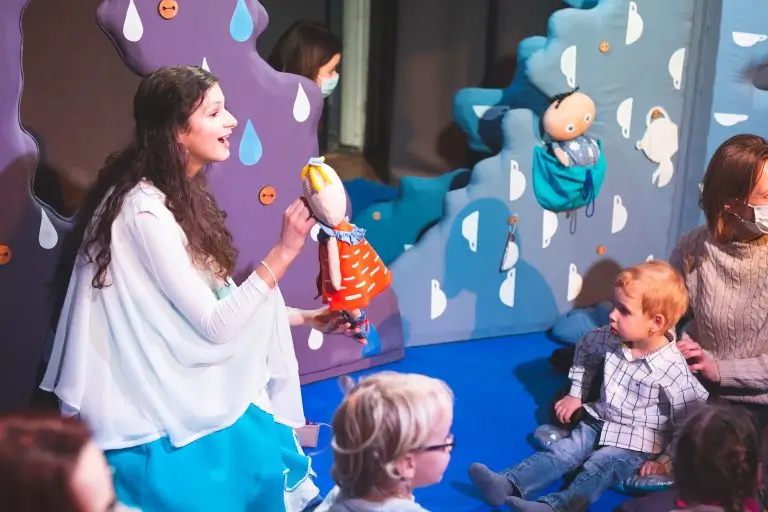 Мы объединяем игру с обучающими микроупражнениями — на наблюдательность, умение ждать своей очереди, любознательные «почему?». Взрослые рядом не «управляют», а поддерживают: улыбаются, легонько подсказывают, делятся восторгом. Интерактивность дозирована, чтобы каждый ребенок мог выбрать собственный темп — просто смотреть, повторять движение или смело придумывать свое. В конце — короткое мгновение тихого удивления: когда облако превращается в челнок, а лента — на радугу, которую можно держать в ладонях.