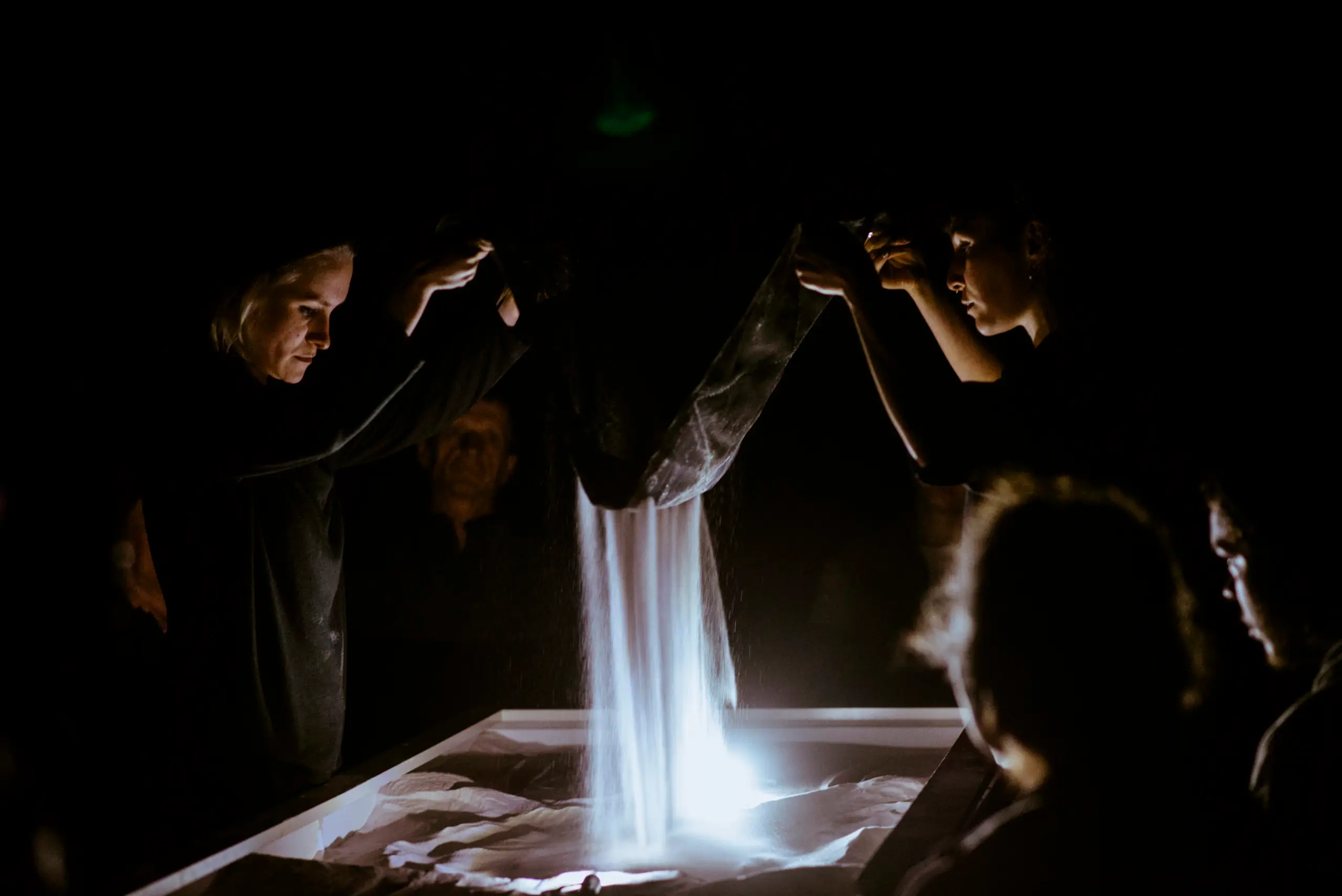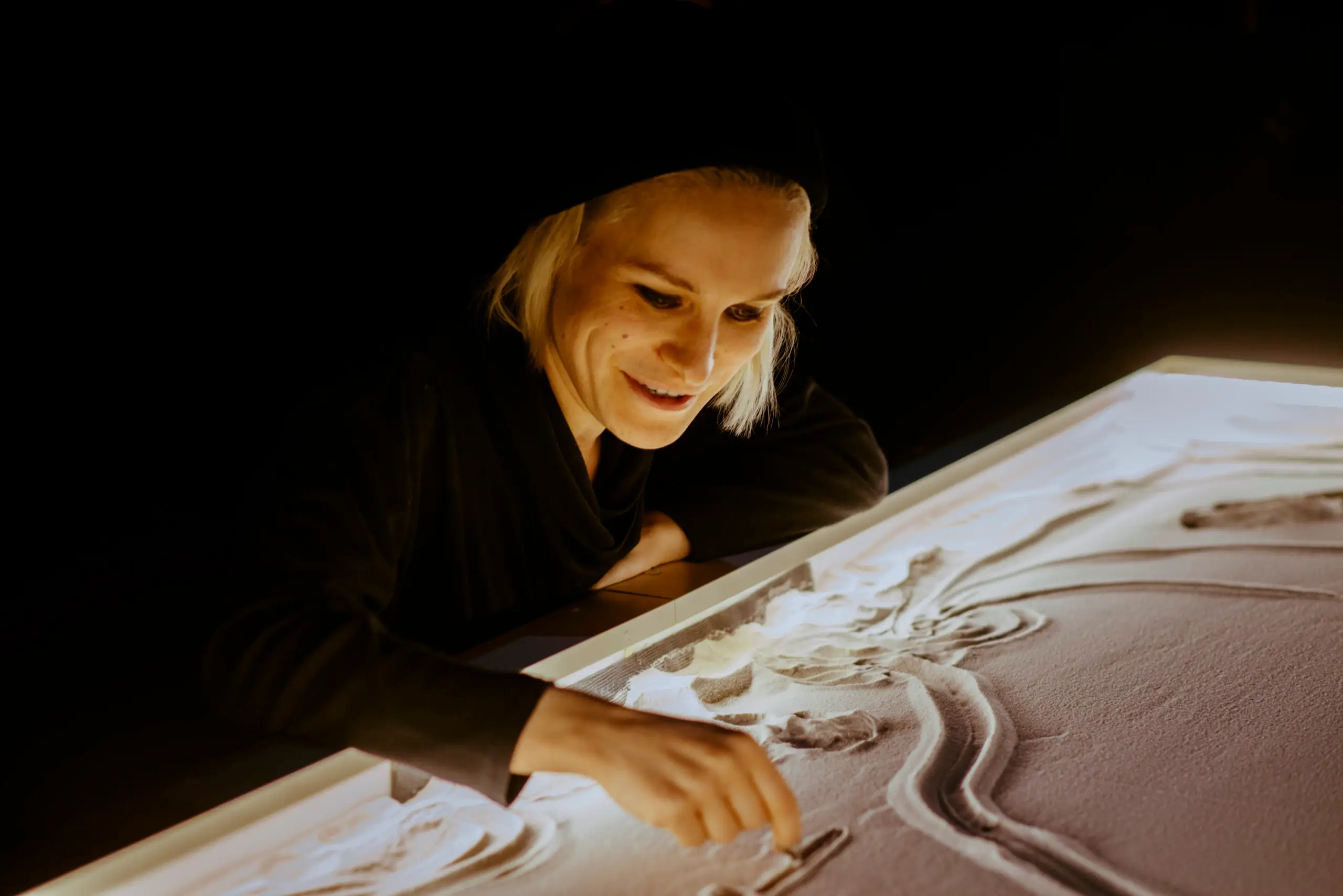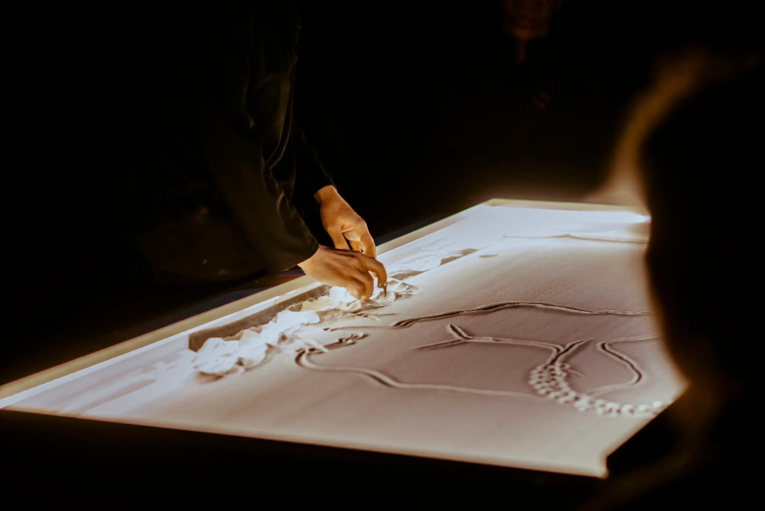 «Мнимые маршруты по Львову» — камерный, интимный перформанс, который из-за игры в песке и живых образах исследует пересечения львовских историй и урбанистических ассоциаций. Здесь нет громкой сцены в обычном смысле — скорее пространство для сосредоточенного созерцания, где важны детали: движения рук, тени, линии на песке, мелкие изменения, которые вдруг складываются в карту. Отправной точкой становится речной песок Полтвы: именно он превращается в «экран» для образов, воспоминаний и городских легенд. Из него вырастают контуры воображаемого Львова — города воды, даже если сегодня эта вода больше не видна.