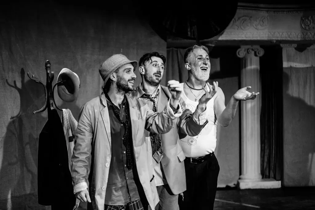 Утро сменяет день, день перетекает в ночь — и все начинается сначала. Двое стоят у одинокого дерева: то на лужайке, то в воображаемом городе, то прямо здесь, в театре. Они ждут. И вместе с ними мы ждем. Смеемся над мелкими неудачами, путаемся в словах, развязываем шнуровки, меряем шляпы, придумываем смыслы там, где их будто и нет. Бекетовский абсурд в этой постановке звучит по-современному: это не «о ком», это — о нас и наших кругах ожидания.
